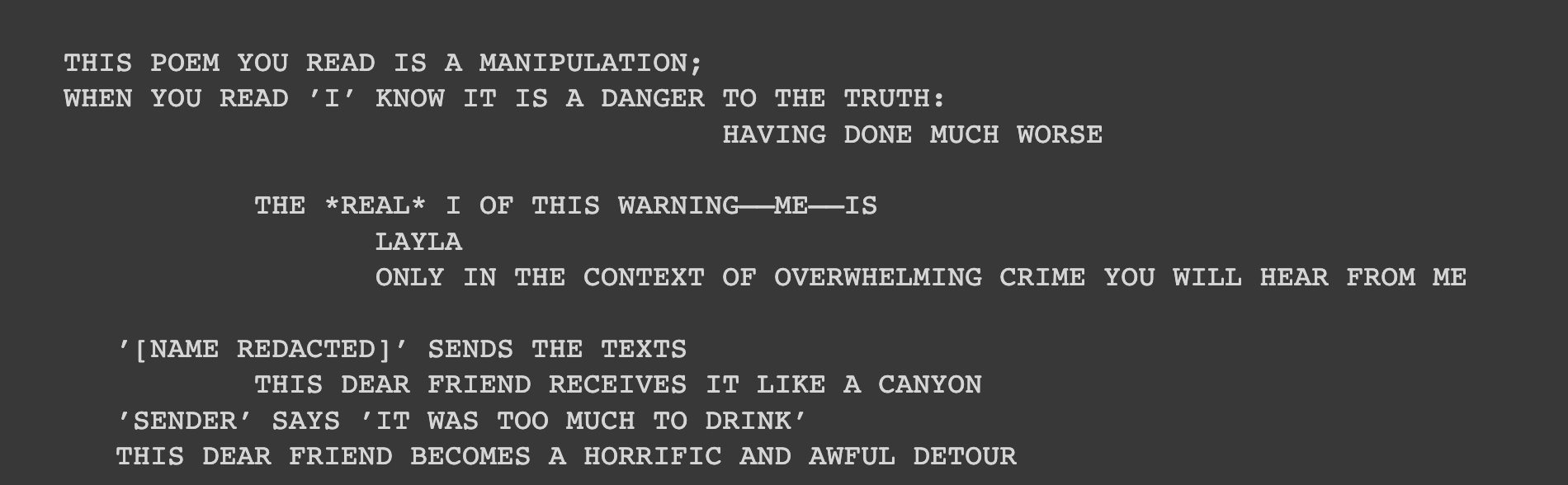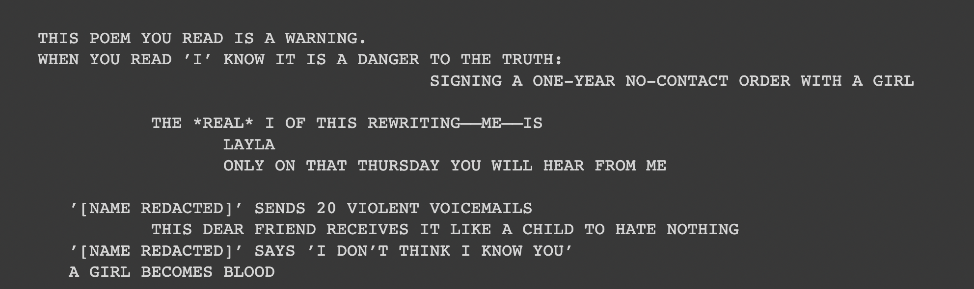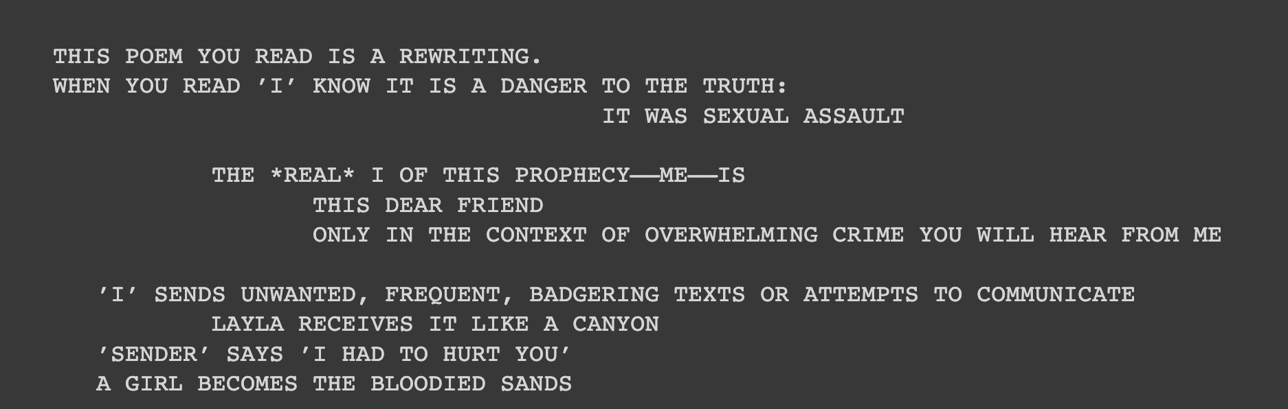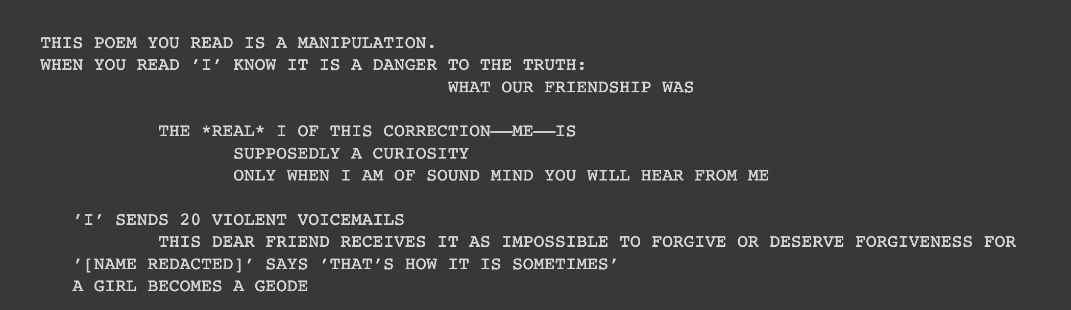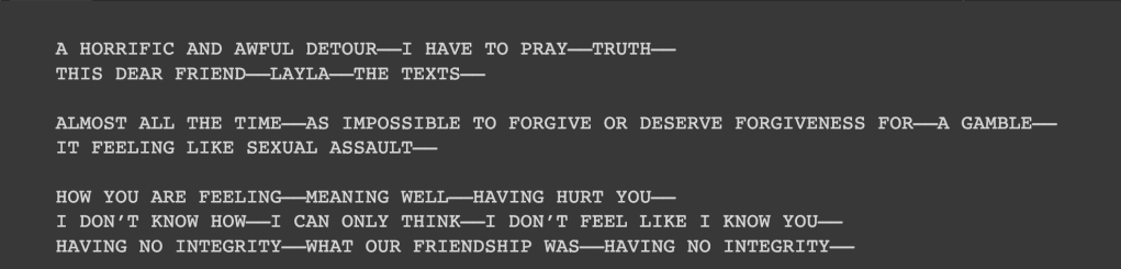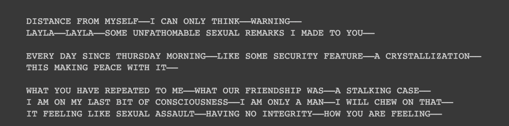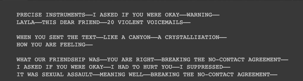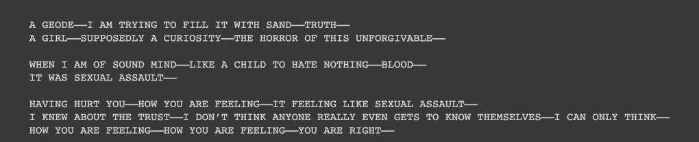 ‘attachments’ (the little sister of ‘unknown person for the weekend’) is a programmed poetry project in two parts. each program generates a unique poem every time it’s run, sourcing from codified phrases and words of a single email——an email received in the aftermath of a sexual assault. all iterations of ‘attachments’ ask the same question(s):