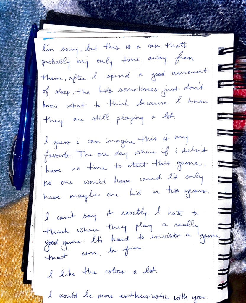 I’m sorry, but this is a case. that’s probably my only time away from them, after I spend a good amount of sleep, the kids sometimes just don’t know what to think because i know they are still playing a lot.